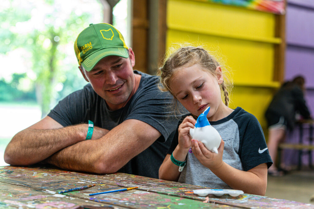 Adults and children sit around a table engaged in arts and crafts activities, with various supplies spread out; a few adults observe in the background.